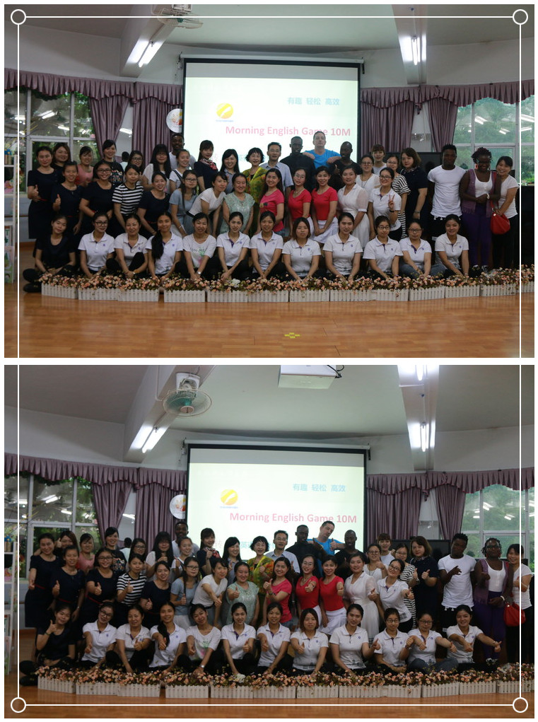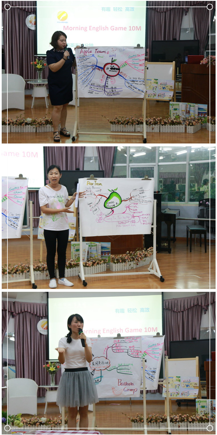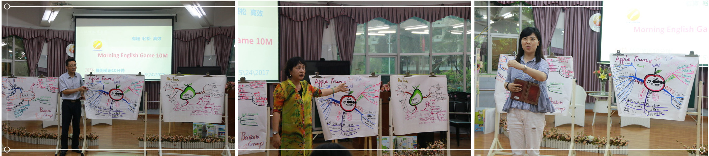 最后,我們的唐玉萍總監(jiān)(上一)、孫樹志老師(下左一)和黃欣園長(下右一)也為我們此次活動做了簡要的點評和梳理,希望我們能做出更進(jìn)一步的修整,也提出了一些更有效的方法意見:創(chuàng)編新穎的英語游戲(New English Game);根據(jù)不同的場地、內(nèi)容,靈活采用不同的組織形式,提高晨間英語游戲的質(zhì)量(quality),如圓形、長方形、U形隊列;內(nèi)容的安排結(jié)合月歷活動及節(jié)假日。如,九月份新生入學(xué),我們以簡單的問候語作為切入,拉近師幼關(guān)系,安撫幼兒剛開學(xué)的焦慮情緒等。