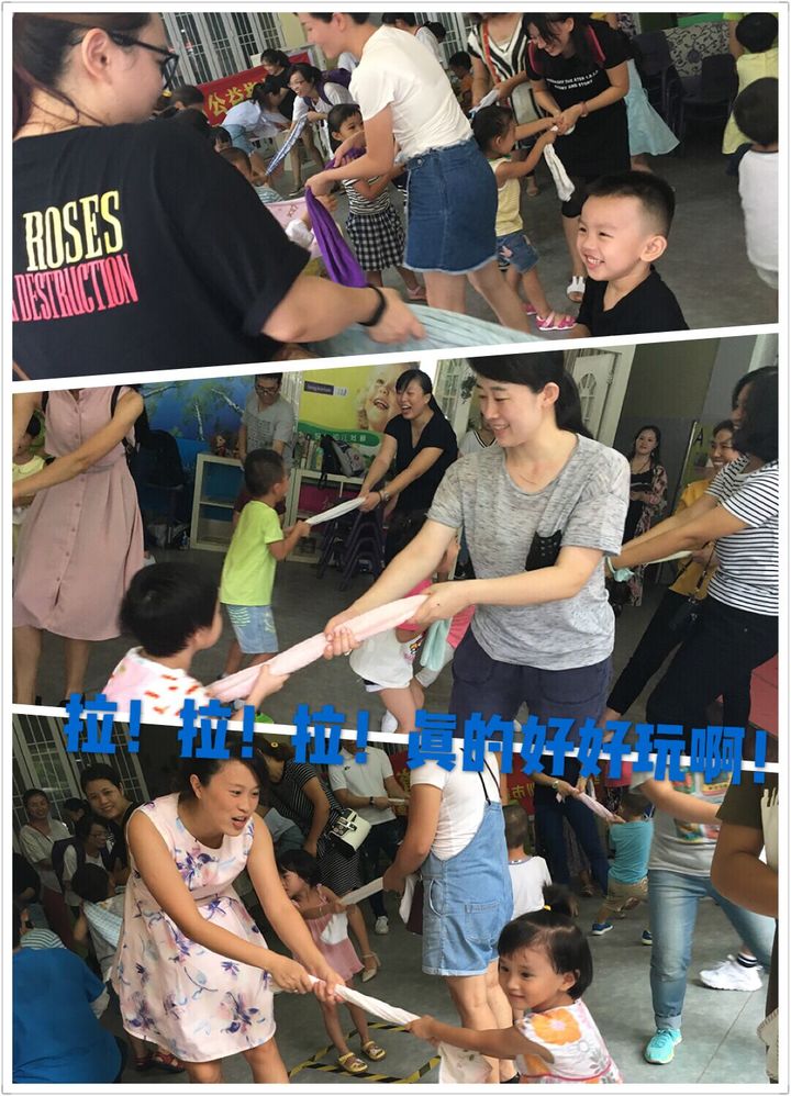 親子游戲活動(dòng)不僅使親子間感到開心、快樂,更是一種情感的交流?;顒?dòng)使家長(zhǎng)融入到孩子的世界中,更重要的是使彼此建立一種互相尊重、信賴的感情。本次親子活動(dòng),主要讓孩子體驗(yàn)毛巾的多種玩法。首先親子音樂律動(dòng)《兩只小鳥》讓家長(zhǎng)和孩子漸漸融入了游戲的氛圍,接著利用毛巾進(jìn)行“拉大鋸”“抓尾巴”“鉆山洞”的游戲,大家都玩得不亦樂呼,充分體驗(yàn)了親子游戲的快樂,真實(shí)感受到了童趣。最讓家長(zhǎng)和孩子玩得瘋狂是的《快樂尋寶》,老師們把很多英語(yǔ)字母藏在活動(dòng)現(xiàn)場(chǎng)的各個(gè)角落,然后讓家長(zhǎng)和孩子分組去尋找字母,現(xiàn)用找到的字母拼成動(dòng)物類、食物類、顏色類、水果類的英語(yǔ)單詞。在有競(jìng)爭(zhēng)的游戲氛圍中,家長(zhǎng)和孩子玩得特別的開心、刺激。