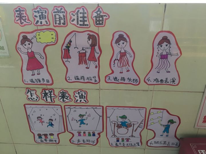 生活指引圖既可以是圖片、繪畫、方向標(biāo),也可以是以幼兒的照片的形式來呈現(xiàn)出一系列的流程圖,讓幼兒通過觀看與模仿,養(yǎng)成良好的生活習(xí)慣。本學(xué)期幼兒園通過研討匯總出班級的生活指引有:我們今天去哪里了、來園五件事、離園五件事、我們的約定、餐具擺放、洗手流程圖、紙巾的使用。同時,我們還按照不同年齡段、不同年級進(jìn)行細(xì)致化的班級生活指引環(huán)境的創(chuàng)設(shè)。小班級的孩子動手能力較弱,他們需要掌握的生活技能比較簡單,例如:學(xué)會擦鼻涕、漱口、穿衣服、穿鞋子、穿襪子及翻閱圖書,中班級在小班級原有的基礎(chǔ)上再加強(qiáng)幼兒的自理能力,如;學(xué)會擦屁股、刷牙、疊衣服等生活技能的提升。到了大班級,孩子們的動手能力以及自理能力已經(jīng)有了很大的進(jìn)步了。同樣,大班也是在中班級的基礎(chǔ)上,再進(jìn)一步增加一些學(xué)習(xí)的方法,如:保護(hù)眼睛、書寫姿勢、修補(bǔ)圖書等。最后獲得生活指引圖創(chuàng)設(shè)最全面、最有創(chuàng)意的是大二班、中二班、小二班。
