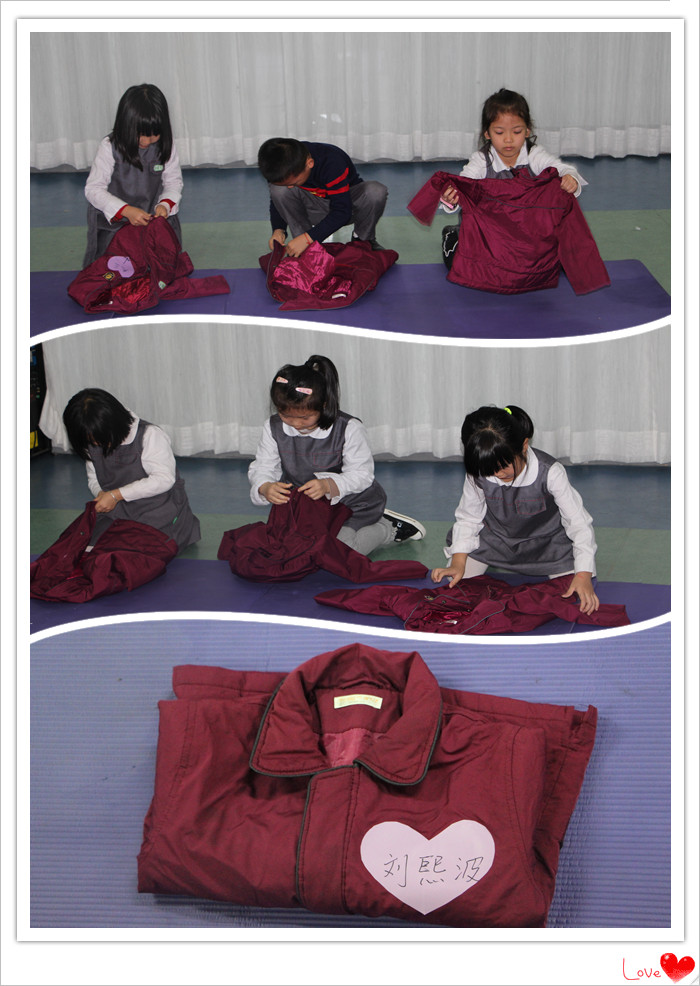 ●中班:套灰色運(yùn)動(dòng)服(套頭衣服并脫下來(lái)整理)