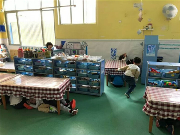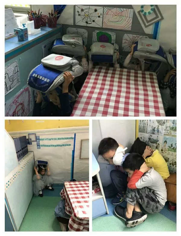 在沒有如何事先告知與準(zhǔn)備的情況下,隨著緊急疏散的信號響起,幼速抱頭、抱后頸,身體蜷曲躲在桌下。
