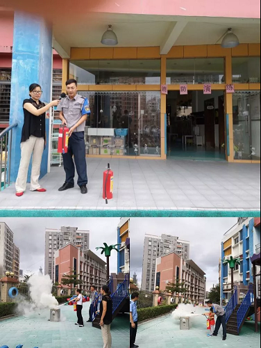 保安叔叔現(xiàn)場(chǎng)進(jìn)行滅火器使用的講解示范,老師和孩子都參與其中,體驗(yàn)正確使用滅火器。
