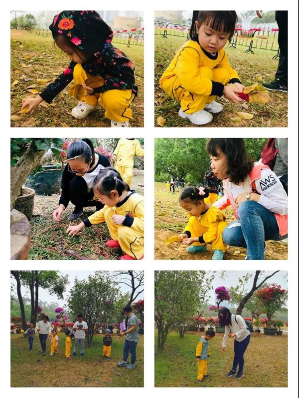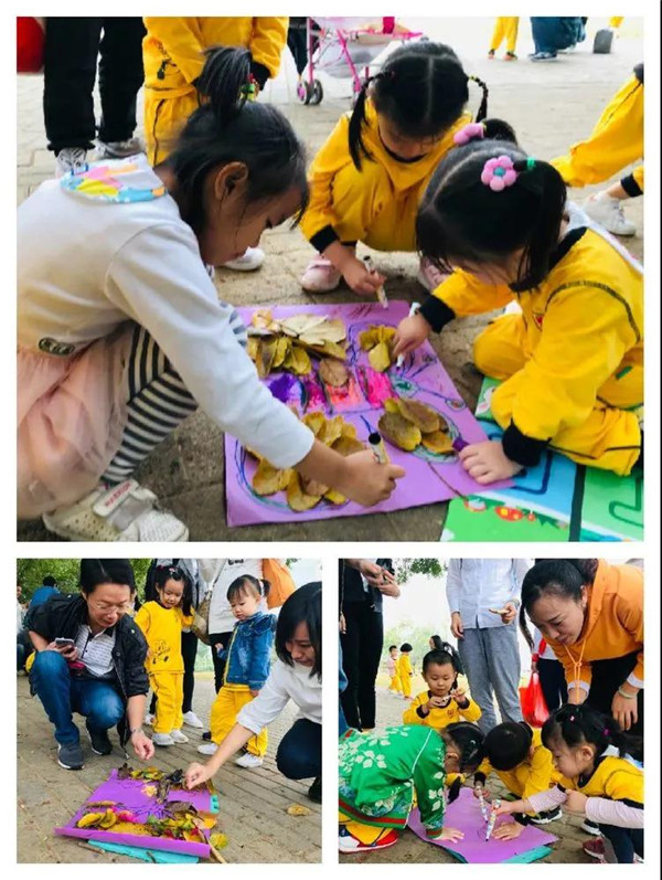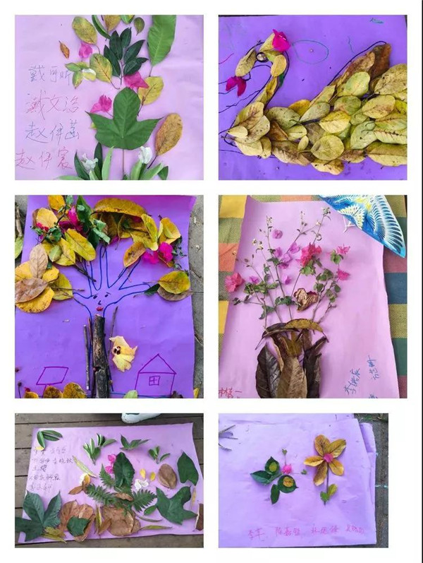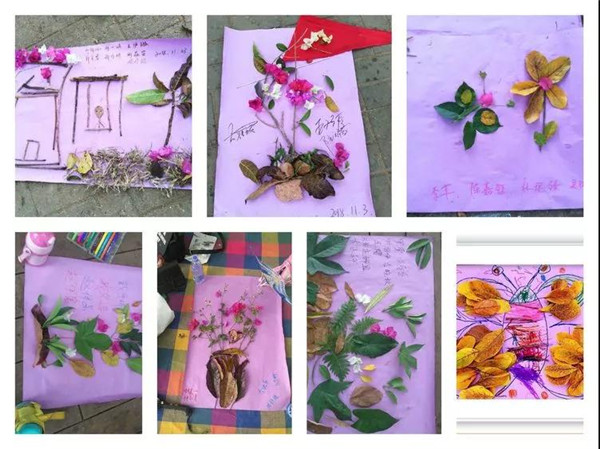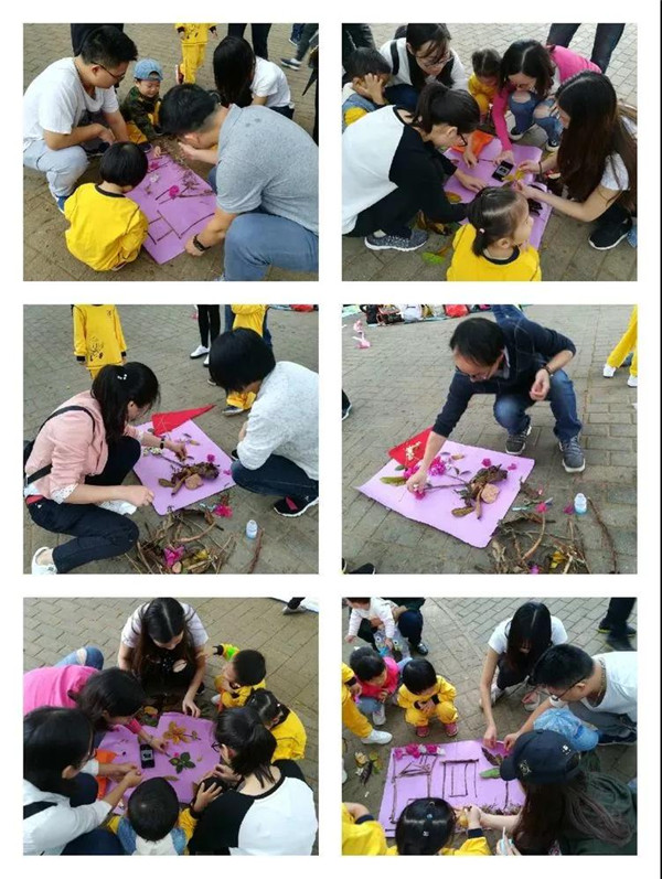 第二個(gè)環(huán)節(jié)是以大自然為主題,按小組為單位撿自然材料與爸爸媽媽共同完成一幅作品,比比誰的最好看!