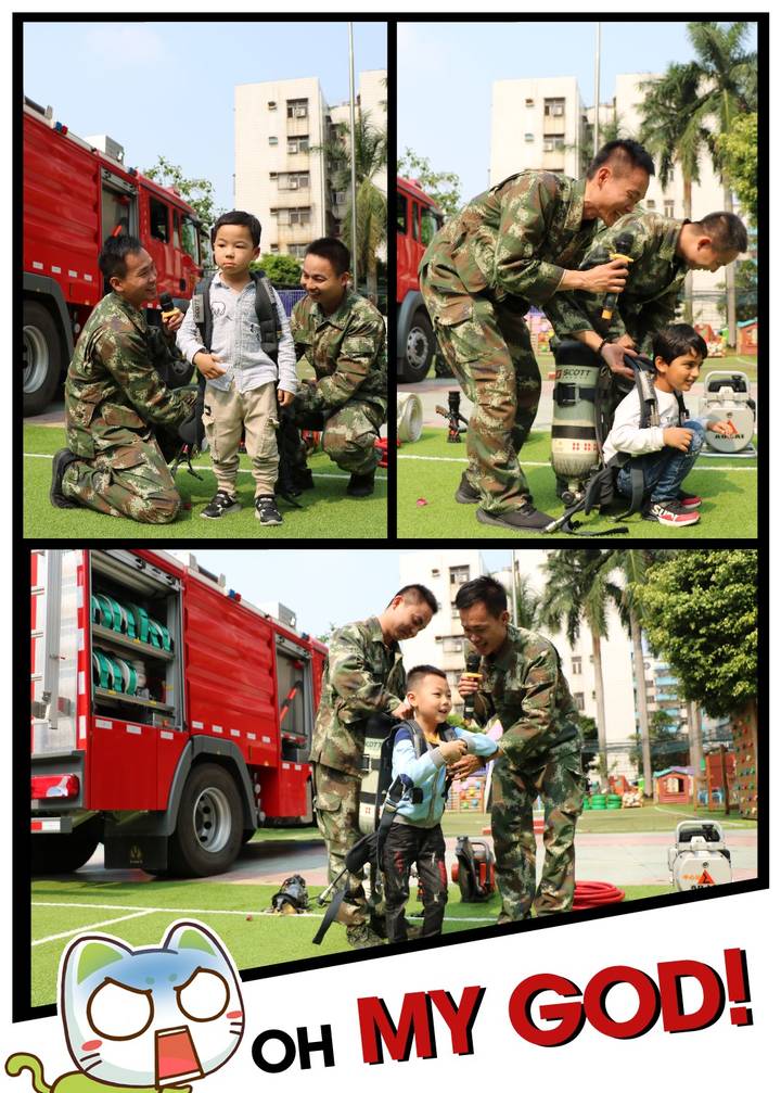 緊接著,消防員叔叔向幼兒介紹了各種不同的消防器械:滅火戰(zhàn)斗服、滅火器、金屬切割機(jī)、消防水槍、水袋、空氣清新劑等及一一介紹了各種不同消防器械的用途與使用方法等。在這炎熱的天氣下,也無(wú)法阻擋孩子們與消防員叔叔認(rèn)真學(xué)習(xí)的精神,讓我們的孩子對(duì)消防安全知識(shí)又得到了很大的收獲。