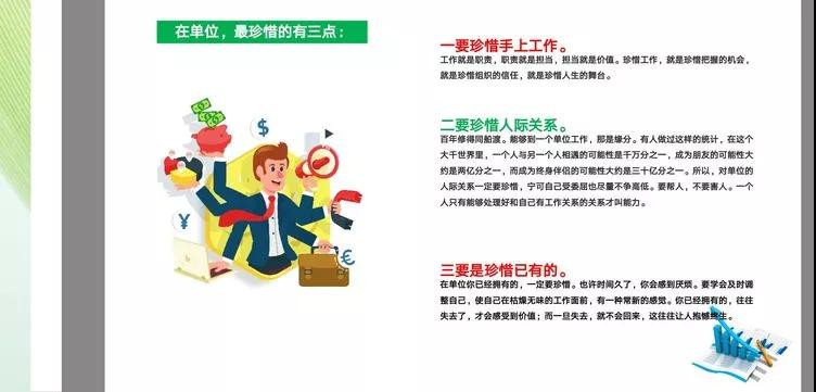 珍惜手上工作,工作就是我們的職責(zé),和擔(dān)當(dāng);珍惜人際關(guān)系,能夠到一個單位工作,那是緣分。對單位的人際關(guān)系一定要珍惜,一個人只有能夠處理好和自己有工作關(guān)系的關(guān)系才叫能力。三要是珍惜已有的。要學(xué)會及時調(diào)整自己,使自己在枯燥無味的工作面前,有一種常新的感覺。