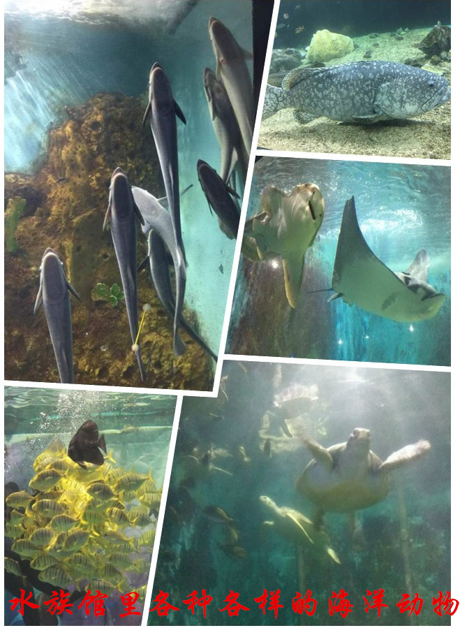 到達(dá)目的地后導(dǎo)游哥哥把我們先領(lǐng)進(jìn)了水族館,一進(jìn)去孩子們看到成群的海洋動(dòng)物都在歡呼尖叫著,“看,那里有海龜海龜...大沙魚(yú)...飛魚(yú)...海星...”我們也跟著孩子們童心大發(fā),好像又回到了孩童時(shí)代,歡樂(lè)無(wú)比,快樂(lè)無(wú)限。