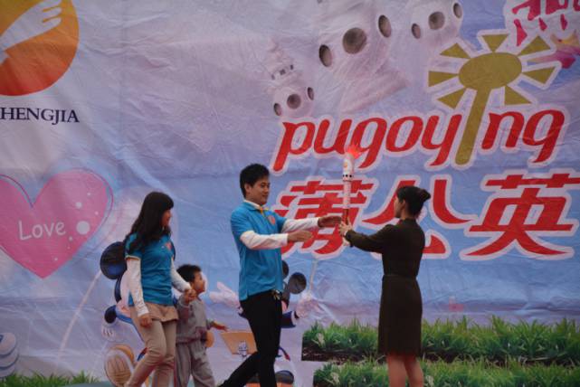 運(yùn)動會的圣火已經(jīng)點(diǎn)燃,從園長媽媽手中接遞的是櫻桃B班代表蔡鎧霖一家