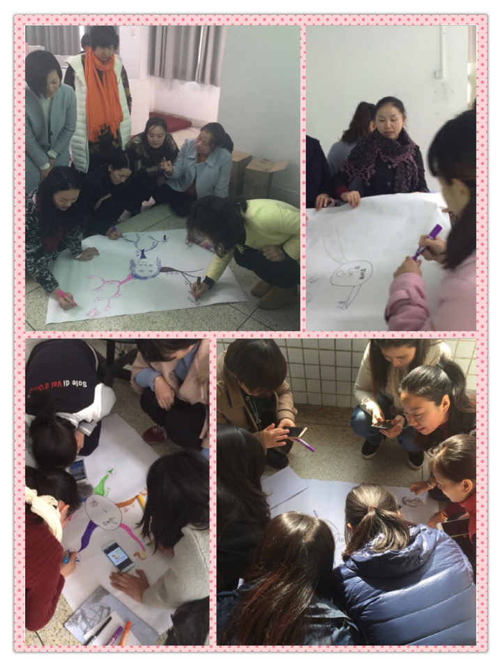 12月31日是我們?cè)凇懊缙怨こ獭睂W(xué)習(xí)活動(dòng)的最后一天,優(yōu)雅睿智的黃娟教授給我們分享了《思維可視化工具在幼兒教育中的應(yīng)用》。思維導(dǎo)圖又叫心智圖,是表達(dá)發(fā)射性思維的有效的圖形思維工具 ,它簡(jiǎn)單卻又極其有效,是一種非常強(qiáng)的記錄思維工具。思維導(dǎo)圖充分運(yùn)用左右腦的機(jī)能,利用記憶、閱讀、思維的規(guī)律,協(xié)助人們?cè)诳茖W(xué)與藝術(shù)、邏輯與想象之間平衡發(fā)展,從而開(kāi)啟人類(lèi)大腦的無(wú)限潛能。她結(jié)合幼兒園孩子的學(xué)習(xí)品質(zhì)給我們列舉了很多適合幼兒園教學(xué)的思維導(dǎo)圖!讓大家茅塞頓開(kāi)!她還分享了思維導(dǎo)圖的8大圖示:圓圈圖 氣泡圖 雙氣泡圖 樹(shù)形圖 括號(hào)圖 流程圖 復(fù)流程圖、橋形圖。最后黃娟教授讓六組老師自選一個(gè)題目通過(guò)思維導(dǎo)圖的形式展現(xiàn)出來(lái)!課堂氛圍馬上活躍起來(lái)!各組教師積極參與討論和繪圖中,十幾分鐘的時(shí)間,一張張各具特色的思維導(dǎo)圖呈現(xiàn)出來(lái)了!黃娟教授對(duì)幼兒園教師的專(zhuān)業(yè)素養(yǎng)給予很高的評(píng)價(jià):幼兒教師不愧是彈、唱、跳、繪畫(huà)樣樣精通的專(zhuān)業(yè)技術(shù)人員!