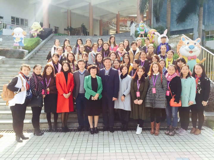 12月30日上午,踏著清晨的露滴,迎著清涼的北風(fēng),和暖的冬日陽(yáng)光一路照射著這群追逐幼教事業(yè)的深圳市學(xué)前教育“苗圃工程”骨干教師研修班的全體學(xué)員來(lái)到東莞!公明二幼教學(xué)園長(zhǎng)譚偉橙、教學(xué)主任陳麗芬也參加了此次培訓(xùn)班,在深圳大學(xué)副院長(zhǎng)唐國(guó)良教授及楊建老師的帶領(lǐng)下,首先來(lái)到了東莞市虎門(mén)東方明珠幼兒園實(shí)踐觀摩,幼兒園占地面積一萬(wàn)多平米,環(huán)境優(yōu)美、空間寬敞、芳草茵茵、悅目怡人,以“美化、綠化,教育化、兒童化”為目標(biāo),老師們的親切熱情,孩子們天真活潑,讓我們充分感受到園所的文化與特色;戶(hù)外體育大循環(huán),把幼兒園的戶(hù)外場(chǎng)地運(yùn)用得淋淋盡致,老師與孩子們?cè)诰G草茵茵的草地上走、跑、跳、爬、鉆的體能訓(xùn)練,讓孩子們真正盡情的擁抱自然,充分感受戶(hù)外活動(dòng)的樂(lè)趣,練就強(qiáng)健的體格,老師、孩子們統(tǒng)一的粉色園服融為一體,在運(yùn)動(dòng)場(chǎng)地上是一道青春亮麗的風(fēng)景。