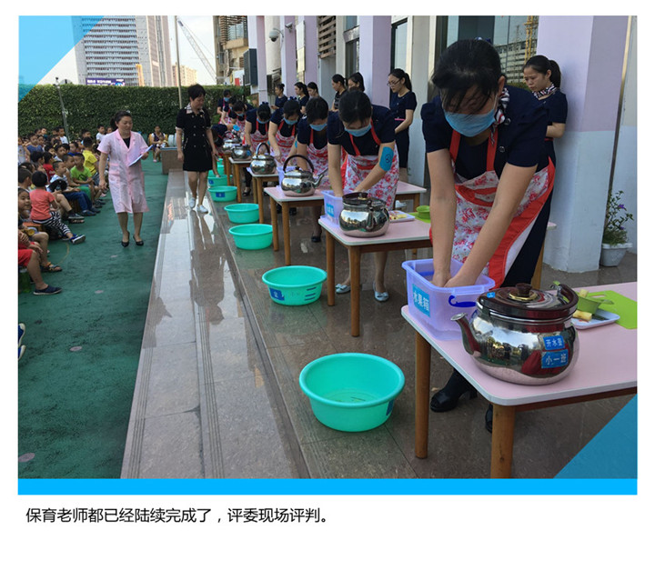 保育員是幼兒園中不可或缺的重要崗位,為了提升幼兒園保教隊伍的素質(zhì),真正做到“保教結(jié)合,教養(yǎng)并重”。我園舉行了一場別開生面的保育員技能技巧大賽。2017年4月19日上午,保育員技能技巧大賽拉開了序幕。此次活動由賴園長、江主任、王醫(yī)生擔(dān)任評委。本著公平公正、相互學(xué)習(xí)的態(tài)度評議各項技能。比賽中,保育員們在極短的時間內(nèi),動作規(guī)范、熟練快速地完成了整理床鋪、桌面消毒、美味水果三個項目。比賽現(xiàn)場氣氛雖緊張但是井然有序,每個人都各盡其能,展示了自己的風(fēng)采。保育員們規(guī)范的操作流程,嫻熟的動作技能讓每一位評委嘆服!