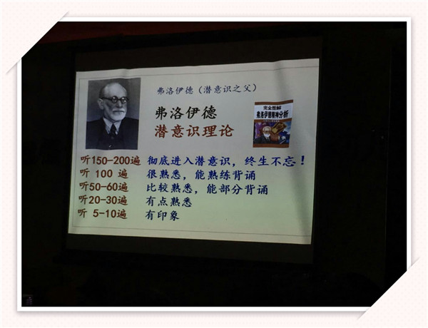最后,譚老師指出了家長的理解能力遠(yuǎn)勝于孩子,但孩子的記憶能力卻強(qiáng)于家長。因此我們要開盡可能地開發(fā)孩子的記憶能力。而弗洛伊德的潛意識理論表明:當(dāng)我們聽某個(gè)東西達(dá)150-200遍時(shí),它就徹底進(jìn)入我們的潛意識,讓我們終生不忘!并且孩子早期的聽力是十分敏捷地,他們能夠一心多用,同時(shí)接受多種信息。