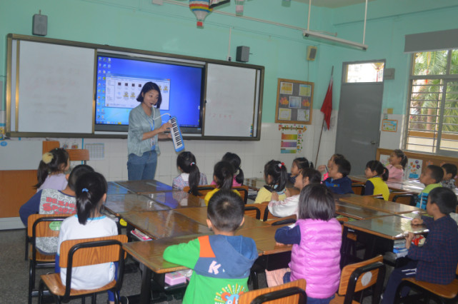 瞧!李老師在給我們介紹實驗班哥哥姐姐豐富的第二課堂:口風(fēng)琴......