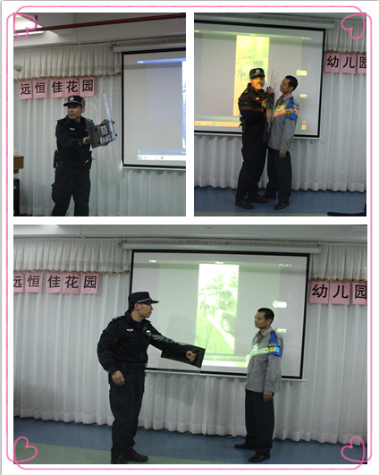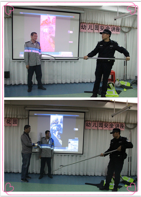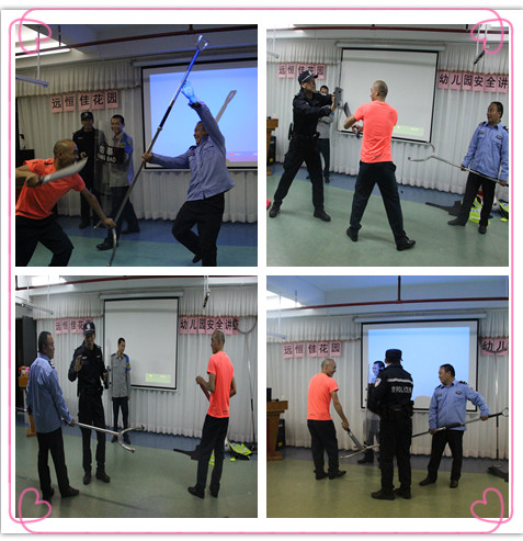 首先,劉教官對于我們身邊的沃爾瑪恐怖事件、羅湖砍殺事件、寶安區(qū)519等暴力事件進(jìn)行了視頻播放和詳細(xì)分析,不僅讓全體教職員工深切體會到了暴力事件的可怕性,而且提高提高了教職工的反恐防暴意識。然后,劉教官分別對于保安和教師的反恐防暴技巧進(jìn)行了演示指導(dǎo)。例如,讓一名保安扮演暴力嫌疑人,對鋼叉和防暴盾牌的使用方法進(jìn)行了指導(dǎo)和演示;老師扮演受害者,演示如何進(jìn)行自我保護(hù)。最后,針對幼兒園的實際情況對反恐防暴提出了以下幾點注意事項:一、一旦有危險人物或暴徒闖入,教師不要慌,一定要保持冷靜;二、關(guān)緊門窗,盡量把孩子與危險人物隔離開,將幼兒隱蔽起,避免近距離接觸,引起傷害;三、一定要想辦法拖延時間,等待救援,盡量避免身體正面接觸,引起不必要的傷亡;四、一旦發(fā)生意外事件,馬上報警,將傷害降到最低程度。