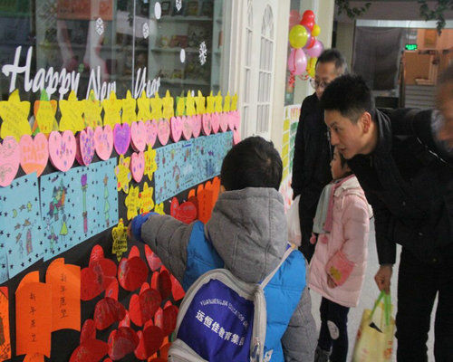 幼兒園大廳兩側的展板還擺放了孩子們的新年愿望。瞧!寶貝們正在向大家介紹自己的新年愿望呢