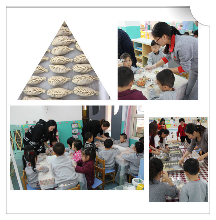孩子們?cè)诶蠋熀图议L(zhǎng)的帶領(lǐng)下包餃子。
