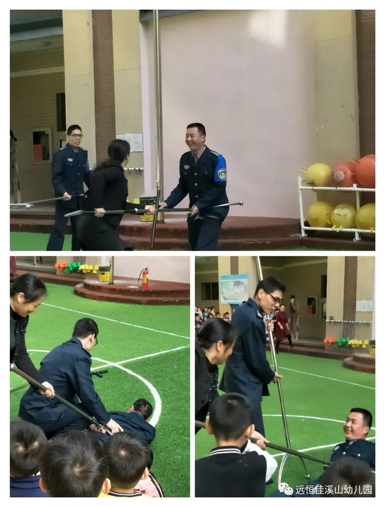 除此之外,安全主任還特別叮囑小朋友們一定要有安全意識(shí),不能輕信陌生人 。有壞人的時(shí)候,要大聲呼喊老師,親人。為了讓孩子更加清楚,現(xiàn)場邀請(qǐng)其中一位保衛(wèi)叔叔,扮作“壞人”,過來“抓”小朋友。這時(shí)候,安全主任和另一名保衛(wèi)叔叔,拿著鋼叉,馬上趕來,和“壞人”斗智斗勇,成功把“壞人”擒獲。
