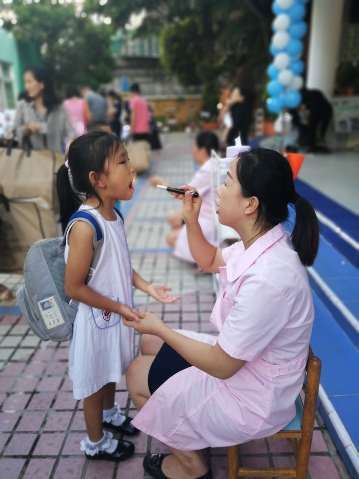 園長(zhǎng)媽媽帶著老師們?cè)缭绲卦谟變簣@門(mén)口熱情地歡迎寶貝們回園;保健醫(yī)生為孩子們細(xì)心地做好晨間檢查;“Welcome back to kindergarten”英語(yǔ)老師也在用英語(yǔ)歡迎孩子們回園;最讓孩子們欣喜的是米妮人偶在校門(mén)口歡迎大家回園。