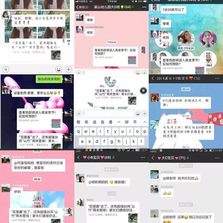 各班老師通過(guò)班級(jí)群向家長(zhǎng)宣傳臺(tái)風(fēng)防御知識(shí)。