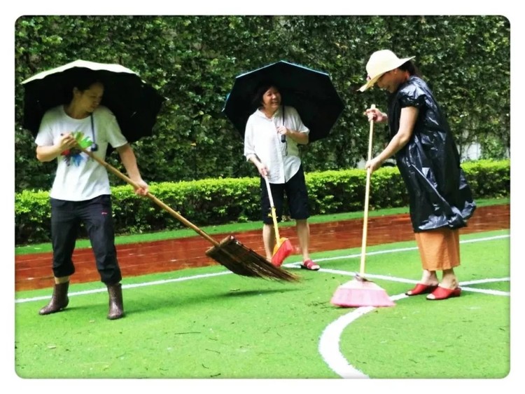 打掃操場(chǎng)時(shí),下起瓢潑大雨,非常敬業(yè)的老師們打著傘冒雨打掃衛(wèi)生。