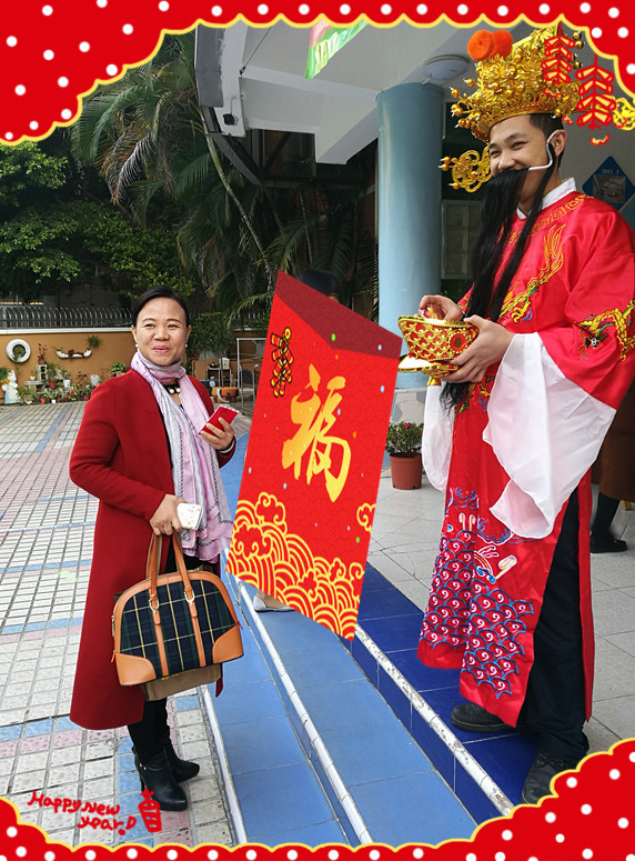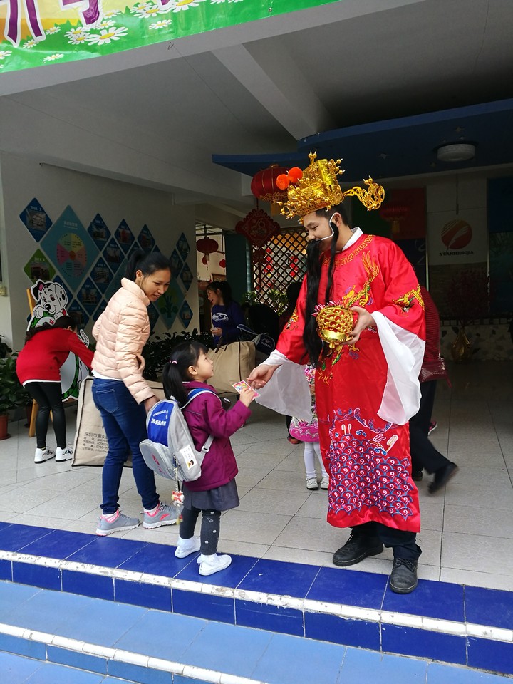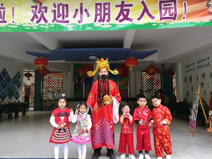 園長(zhǎng)媽媽帶著老師們也早早地在幼兒園門口熱情地歡迎寶貝們回園;保健醫(yī)生為孩子們細(xì)心地做好晨間檢查;“Welcome back to kindergarten”英語老師也在用英語歡迎孩子們回園;最讓孩子們欣喜的是財(cái)神爺帶著金童玉女在校門口迎接大家,并送上裝有糖果的利是紅包,給新年第一天回園的孩子們帶來了一天美好的心情。