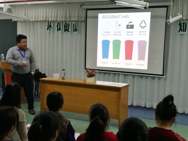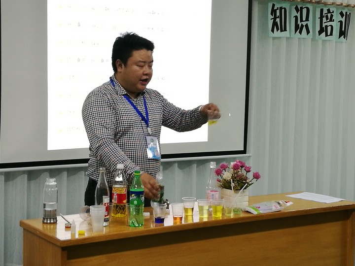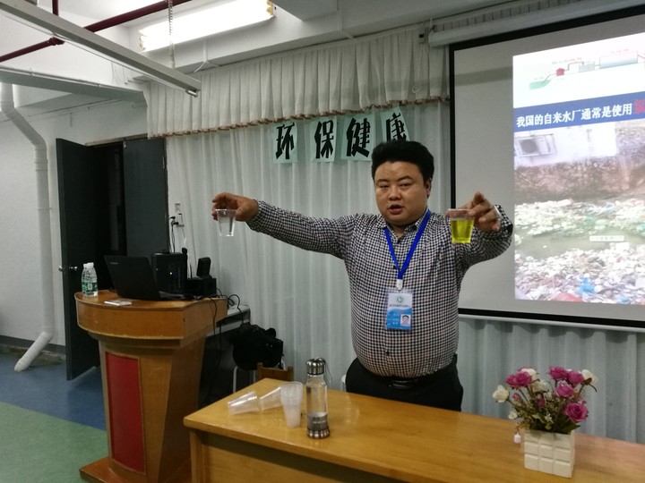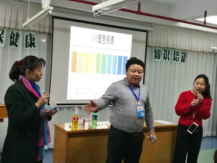本次講座十分榮幸地請到了新生活環(huán)境保護與治理中心的唐維副主任,在第一個環(huán)節(jié)他向大家講解了什么是垃圾分類、垃圾分類的意義、以及垃圾可以分為可回收垃圾、廚余垃圾、有害垃圾、其他垃圾這四類。在第二個環(huán)節(jié)唐維副主任又向大家拋出一個問題--家庭環(huán)保你是否注意?首先,唐維副主任提出自來水的唯一處理方式是過濾。接著,他又提出水質(zhì)決定體質(zhì)這個觀點,水可以分為呈酸性的水和呈堿性的水,而我們?nèi)梭w所需要的是堿性的水。最后,唐維副主任通過實驗向大家展示了哪些是呈酸性的水,哪些呈堿性的水。通過這些生動有趣的實驗,老師們初步了解到純凈水是呈酸性的水,而礦物質(zhì)水是呈堿性的水,因此我們平常應該多喝礦物質(zhì)水。