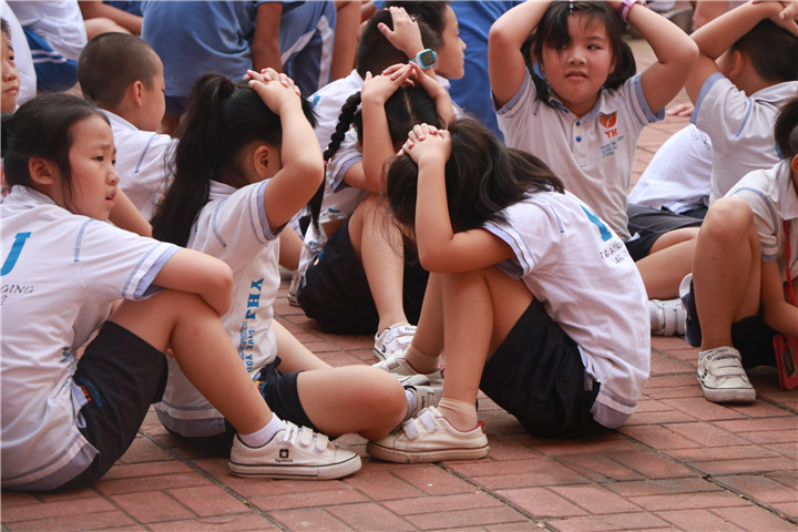 第一階段,演練過(guò)程中,當(dāng)學(xué)生們聽(tīng)到“地震發(fā)生”的信號(hào),老師組織學(xué)生進(jìn)行避震,反映迅速,動(dòng)作標(biāo)準(zhǔn)。