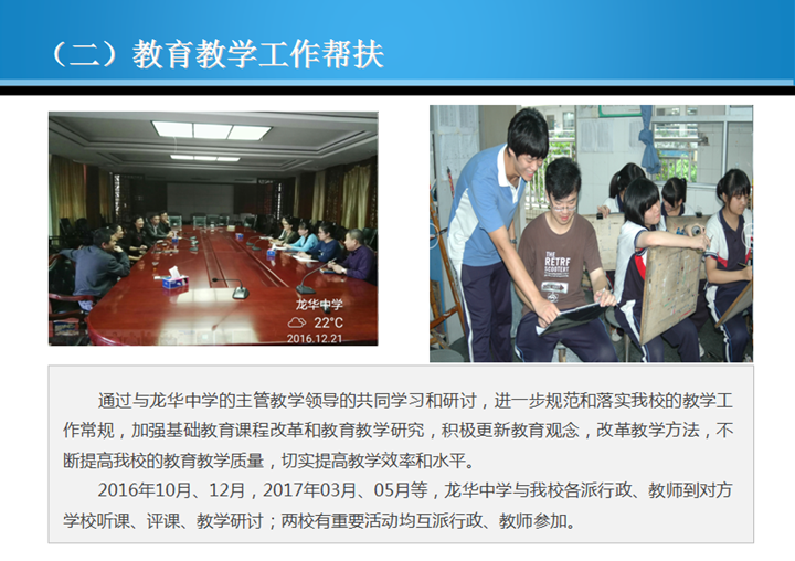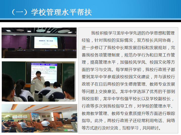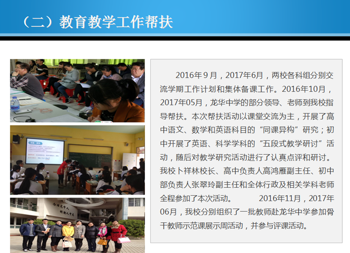 深圳市龍華中英文實(shí)驗(yàn)學(xué)校自2009年初與龍華中學(xué)結(jié)成“一對(duì)一”幫扶對(duì)子,至今已達(dá)9年,兩校的交流活動(dòng)覆蓋學(xué)校管理、教育教學(xué)、學(xué)科活動(dòng)、復(fù)習(xí)備考、教師培訓(xùn)等各領(lǐng)域,一直以來(lái),開(kāi)展情況良好。隨著交流的深入,兩校的聯(lián)系會(huì)越來(lái)越緊密。相信兩校會(huì)共同努力,為龍華區(qū)的教育發(fā)展做出更大的貢獻(xiàn)!