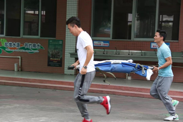 救援隊(duì)第一時(shí)間趕往事發(fā)地點(diǎn)進(jìn)行搶救并把“受傷”學(xué)生送往安全地帶