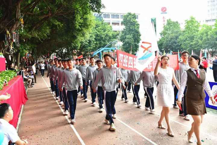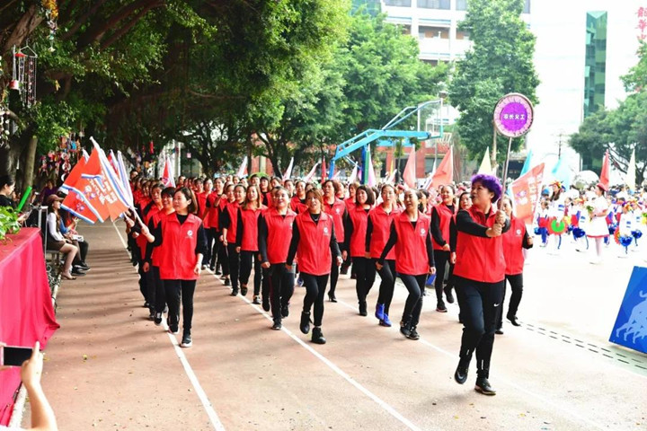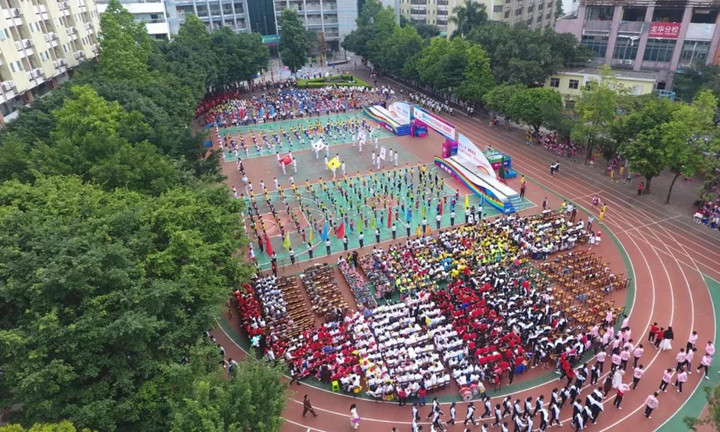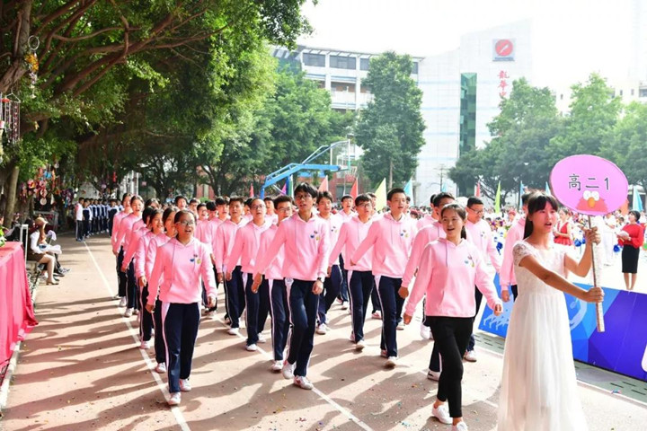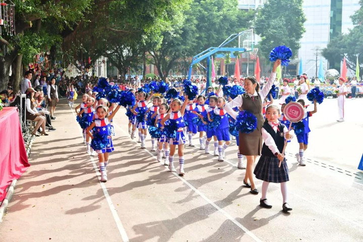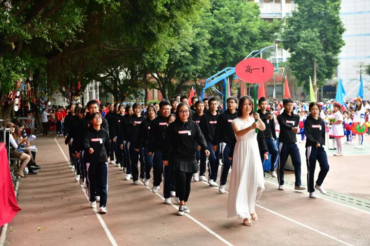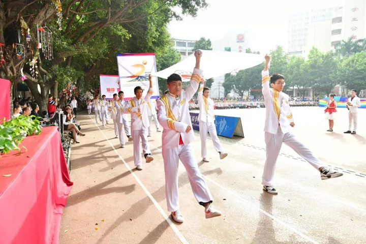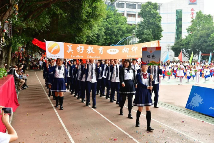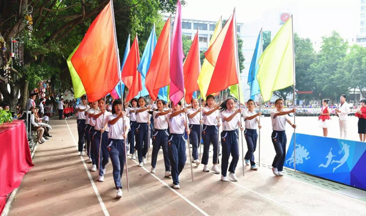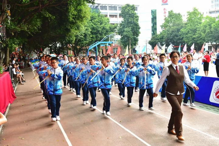 首先進行的是隊列式表演,小學(xué)、初中、高中等70多個方陣魚貫入場,一時運動場上形成了一道由色彩鮮艷的服裝和絢麗多彩的道具組成的靚麗風(fēng)景,學(xué)生們步伐矯健,口號嘹亮,精神抖擻,走出了士氣,走出了自信,贏得了家長和來賓的陣陣掌聲。