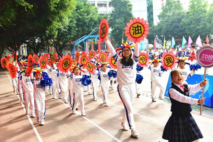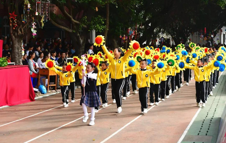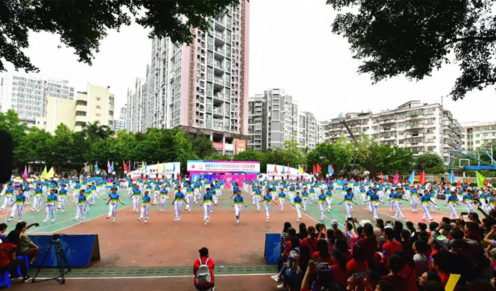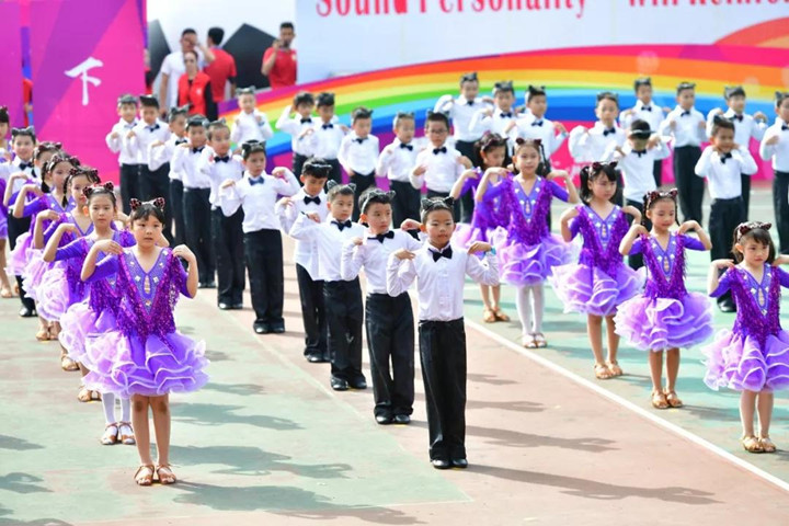 學(xué)生大型團體操和舞蹈表演在《彩旗飄飄》中展開,全校小學(xué)、初中、高中2000多人分別參加了繩操、打擊樂、跆拳道、拉丁舞、啦啦操、響扇、球類組合等大型節(jié)目演出,全面展示了本學(xué)期體育、藝術(shù)“分組分項”教學(xué)改革及“2+2”項目實施的成果。宏大的活動場面、精彩的表演深深吸引住了家長和來賓,孩子們開心的笑容、激昂的神情感染了全場,引來喝彩聲陣陣,歡樂不斷回響。