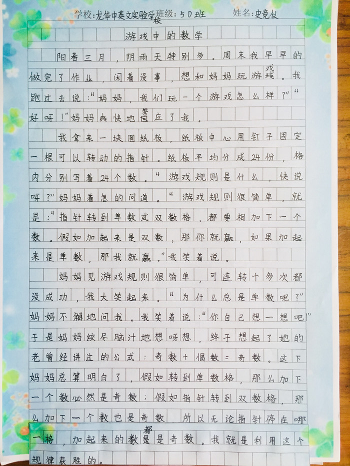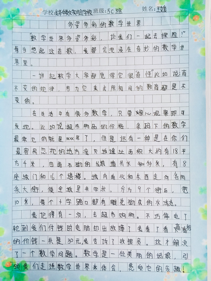 五年級:數(shù)學(xué)作文,用數(shù)學(xué)描述著生活,體會數(shù)學(xué)來源于生活,與我們的數(shù)學(xué)息息相關(guān)。