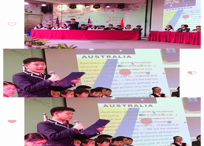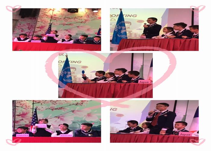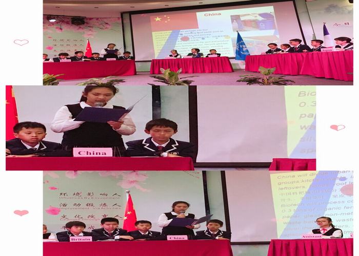 5-6年級(jí)的孩子們則充分發(fā)揮了高段英語(yǔ)語(yǔ)言能力優(yōu)勢(shì),召開了以《在全世界倡導(dǎo)垃圾分類和環(huán)保》為主題的“模擬聯(lián)合國(guó)大會(huì)”。