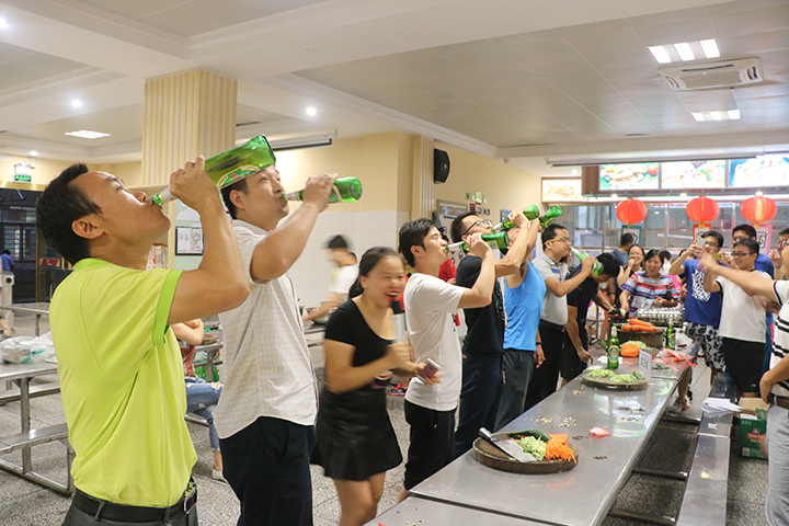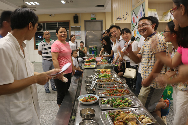 教師廚藝比賽是公明中英文學(xué)校建設(shè)幸福校園,活躍教職工業(yè)余生活的一項(xiàng)舉措?;顒?dòng)將全校教師分成六個(gè)組,每組給予一定的經(jīng)費(fèi),食材自行購(gòu)買,要求每組各出16個(gè)菜,其中4個(gè)菜參加評(píng)分,其余的菜參與交流?;顒?dòng)當(dāng)天正好是運(yùn)動(dòng)會(huì),老師們得以有時(shí)間到市場(chǎng)精選食材。下午5點(diǎn)鐘,運(yùn)動(dòng)會(huì)結(jié)束,學(xué)生全部離校后,老師們按照事先的分工有序的忙碌起來(lái)。洗菜、切菜、雕花、拼盤,平時(shí)溫文爾雅的老師現(xiàn)在儼然一個(gè)個(gè)大廚,鍋鏟飛舞、菜色琳瑯、滿室顠香,各組選派的廚師們輪番上陣,一人一個(gè)自己的拿手好菜,“我心飛翔”、“青龍臥雪”,不但看得人垂涎欲滴,連名字都起得這么有意境。在另一個(gè)賽場(chǎng),進(jìn)行的是”刀工、嗑西瓜子、喝啤酒和蒙眼喂甜筒比賽,比賽規(guī)定,四個(gè)項(xiàng)目積分最后的一個(gè)組,全組組員要喝苦瓜汁。為了不讓自己的組員出丑,場(chǎng)上隊(duì)員盡力表現(xiàn),場(chǎng)下組員吶喊助威,滿臉的奶酪、對(duì)瓶吹啤酒的表情,嗨翻了全場(chǎng)。