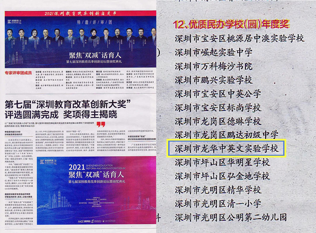 當(dāng)前位置:應(yīng)用>最新動(dòng)態(tài)> 深圳市龍華中英文實(shí)驗(yàn)學(xué)校獲“深圳市優(yōu)質(zhì)民辦學(xué)校年度獎(jiǎng)”,并獲《南方都市報(bào)》專版報(bào)道