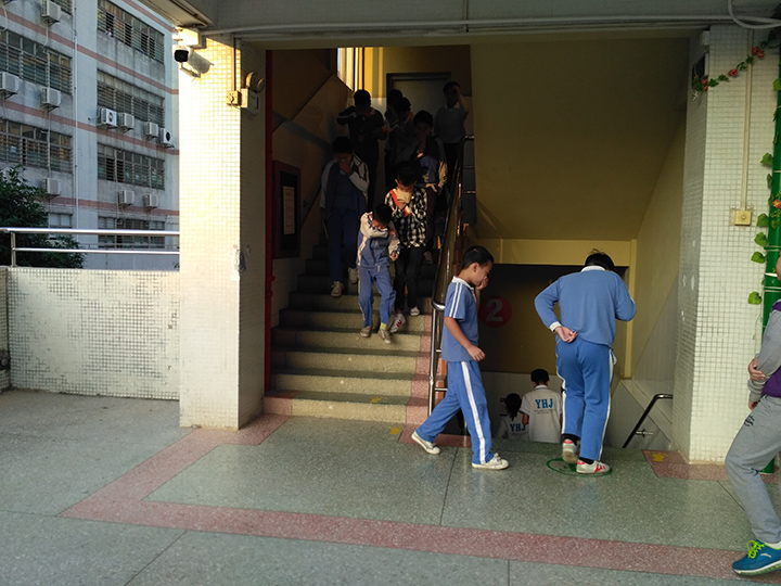 七點(diǎn)零五分安全警報(bào)聲響起,學(xué)生們手拿毛巾捂住口鼻,從宿舍跑出來(lái),彎腰扶著扶手迅速有序的往樓下疏散。用了45秒就全部疏散到指定的地點(diǎn),演習(xí)非常成功。