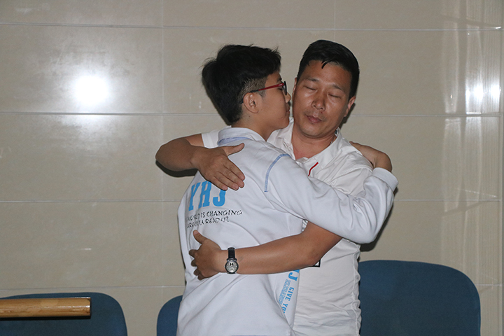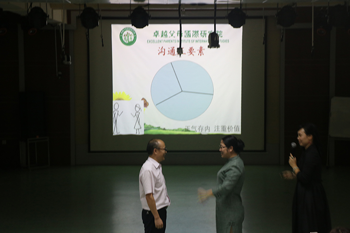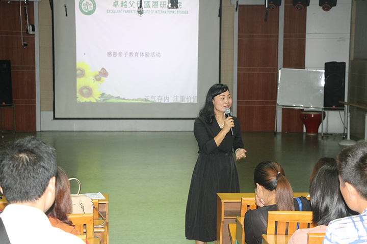 講座中,祝主任通過觸動心靈的演講、親子游戲和感情的渲染力,使現(xiàn)場大部分的老師、家長和同學都流下了眼淚,體驗愛的感覺。