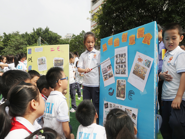作為一所民辦學(xué)校,公明中英文學(xué)校的外來工子女占到90%之多,為讓孩子們盡快適應(yīng)、喜歡、融入這座城市,本學(xué)期該校選擇了“多彩深圳”這一主題做為主題方案學(xué)習(xí)內(nèi)容。主題確定后,各年級圍繞該主題再選擇子主題,比如一年級選擇景點、二年級選擇美食、三年級選擇交通、四年級選擇建筑等,然后各班再根據(jù)年級主題采用頭腦風(fēng)暴確定展示的內(nèi)容、方式和任務(wù)分工。朋友間交流、向家長請教,上網(wǎng)絡(luò)查詢,同學(xué)們通過各種方式收集、整理相關(guān)內(nèi)容,并通過手抄報、繪本的形式制做主題展板?;顒赢?dāng)天,當(dāng)各班的展板呈現(xiàn)在師生家長面前時,整個展區(qū)匯成了一個五彩斑瀾的知識海洋?!斑@是深圳的知名企業(yè),騰訊、華為……”,“地王大廈正式名為信興廣場……,創(chuàng)造了世界超高層建筑最“扁”最“瘦”的世界紀(jì)錄”,孩子們在展位前如數(shù)家珍,向師生家長介紹深圳的各種特色,吸引了大批的參觀者駐足了解。三D班制做的深圳機(jī)場模型,維妙維肖,做工精致,不少家長拿出手機(jī)拍照留念。而四年級設(shè)制的有獎問答,只要答對問題,便能得到一份現(xiàn)場制做的美食,吸引同學(xué)們排起了兩條長龍。(文、程?。?span>