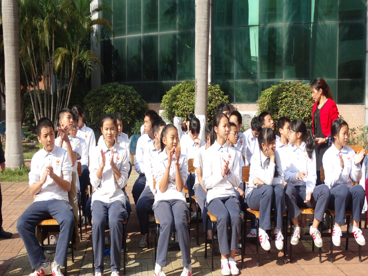 一大早,饒灑榮老師便帶領學生將評委席布置好了。大課間鈴聲一響,初中部各班(九年級除外)便在班主任老師的帶領下帶著各自的凳子,有序的來到了教學樓前坪,并在相應的位置就坐。