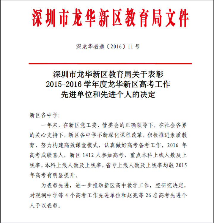 2016年12月02日上午,龍華新區(qū)教育局召開龍華新區(qū)2016年中、高考工作總結(jié)大會,深圳市龍華中英文實驗學(xué)校獲得了“龍華新區(qū)2016年高考先進(jìn)單位”榮譽稱號。