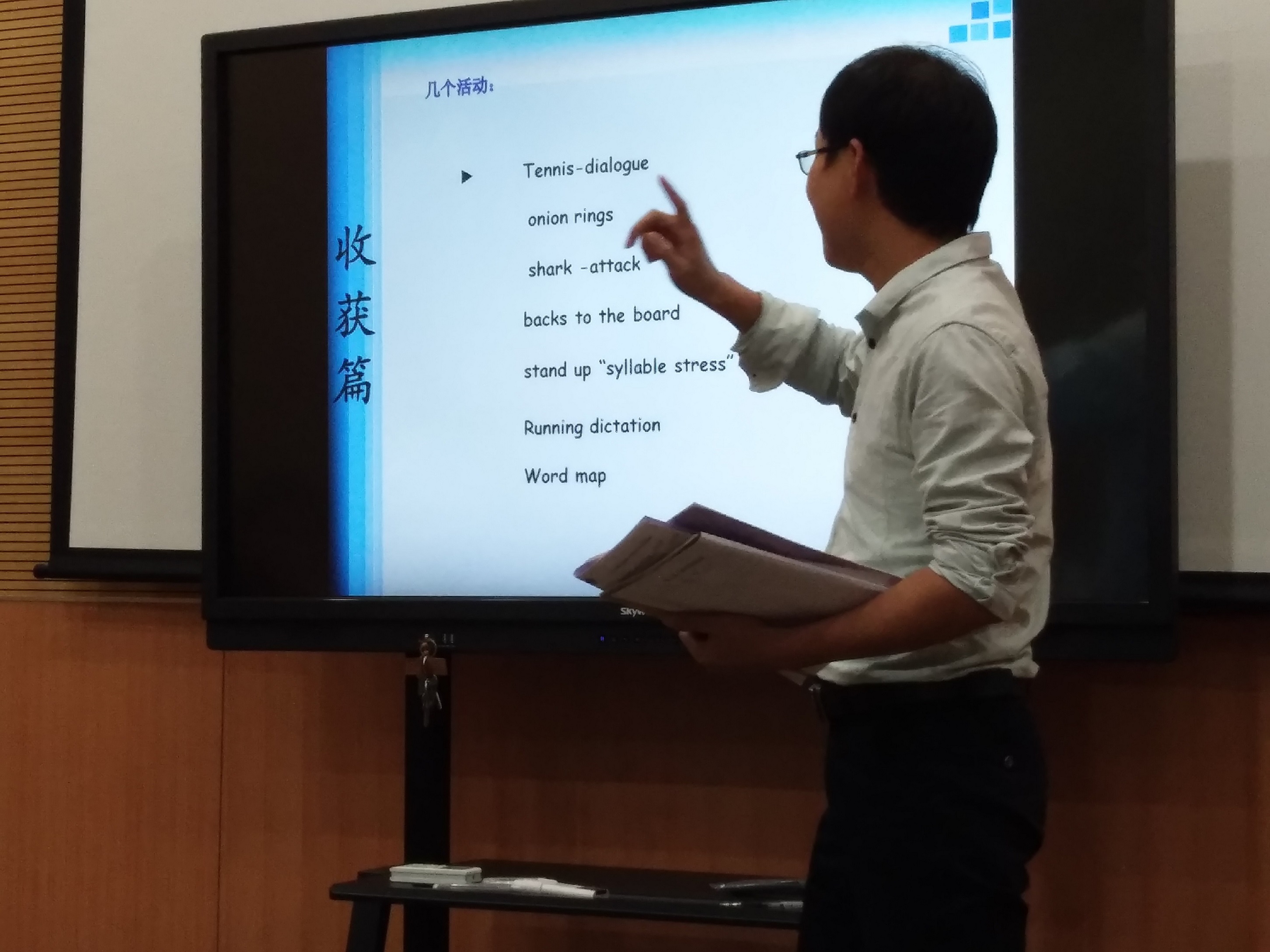 是的,作為一名英語教師,必須注重提升英語學(xué)科素養(yǎng):語言品質(zhì)、文化品質(zhì)、思維品質(zhì)、學(xué)習(xí)能力。他還與大家一起分享了英語課堂中的幾個精彩活動,如Tennis-dialogue,onion rings,shar-attack,back to the board,stand up”syllable stress”,running dictation等,都是老師們極度喜歡的。此次分享非常精彩,也為老師提供了一些有效的教學(xué)手段。(圖/文  張嘉晉)