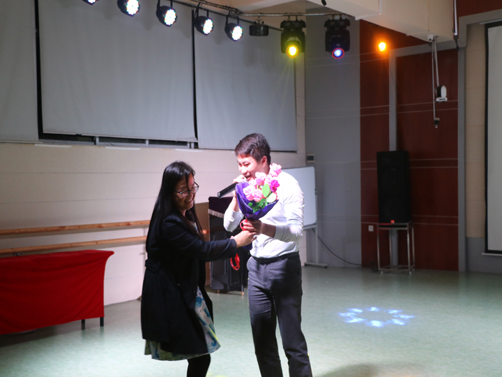活動在一場T臺秀中拉開序幕,沒有華麗的服飾,沒有炫彩的妝容,但十多位女教師用職業(yè)裝在舉手投足間展現(xiàn)出良好的精神面貌和職業(yè)素養(yǎng),贏得了滿堂喝彩。接著,唱歌、舞蹈、輪滑、悠悠球,一個個讓人驚幸喜的節(jié)目輪番上臺,這些平時溫文爾雅,在工作中默默奉獻的老師展現(xiàn)了他們多才多藝的另一面,讓觀眾大開眼界。語文老師廖義玲的風手琴獨奏《啊朋友再見》,琴聲婉轉連綿、曲折優(yōu)美,讓觀眾體驗到意大利民歌的豪放與壯闊。體育老師陳代坤現(xiàn)場書法大鵬展翅,讓人體驗到力與美的結合。還有美術老師何倫,僅用四分鐘的時間便用彩紙折出一束"鮮花“,有百合、郁金香、玫瑰…,栩栩如生、美侖美奐。最讓人拍案叫絕的是老師們自編自演的兩個節(jié)目“雙簧”和小品“我為海選狂”,演員們表演到位、笑點頻出,整場讓人捧腹不止,眾望所歸地被評為一等獎。
