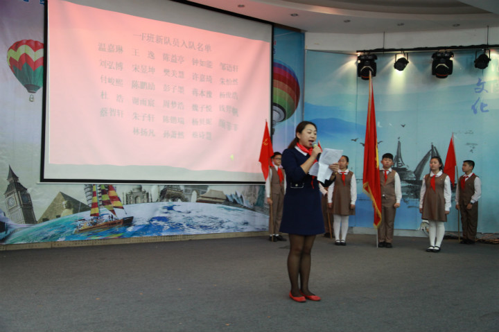 首先,少先隊(duì)大隊(duì)輔導(dǎo)員張丹老師宣讀了新隊(duì)員名單,然后新隊(duì)員們走上舞臺進(jìn)行儀式,當(dāng)老隊(duì)員們把鮮艷的紅領(lǐng)巾戴在新隊(duì)員胸前時(shí),每一張可愛的小臉上都洋溢出純真而自豪的微笑。隨后,新隊(duì)員在大隊(duì)長陳思穎的帶領(lǐng)下莊嚴(yán)宣誓——“我是中國少年先鋒隊(duì)隊(duì)員,我在隊(duì)旗下莊嚴(yán)宣誓:我熱愛中國共產(chǎn)黨,熱愛祖國,熱愛人民,好好學(xué)習(xí),好好鍛煉,準(zhǔn)備著:為共產(chǎn)主義事業(yè)貢獻(xiàn)力量!”——鄭重、宏亮、整齊的聲音響徹了整個(gè)校園!