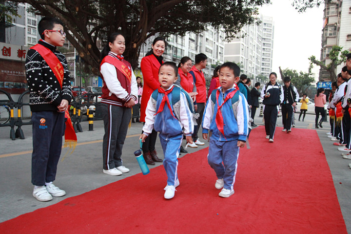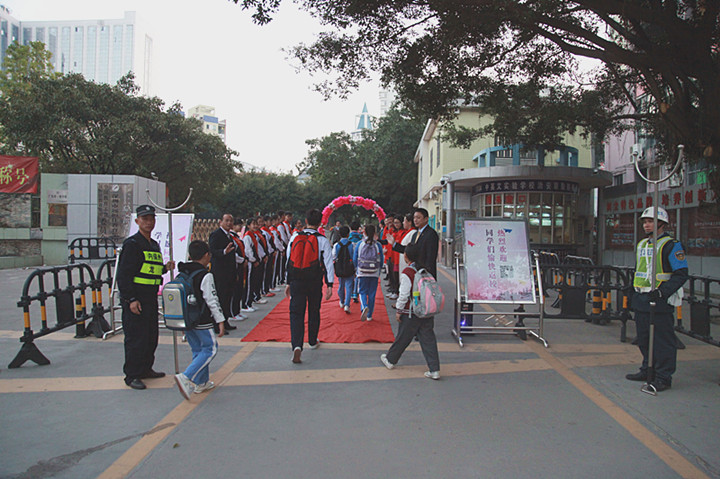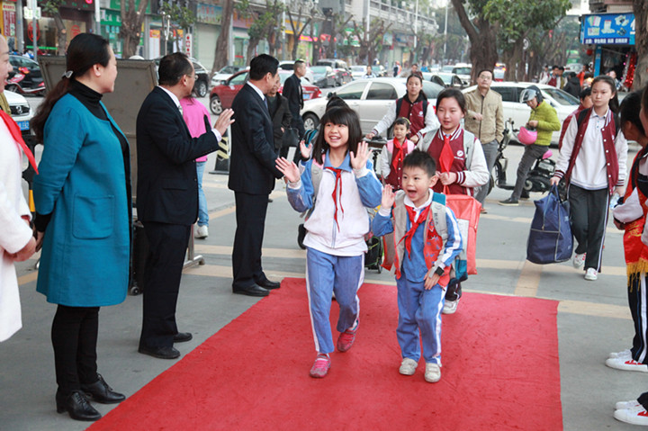 2017年02月13日早6:30,當(dāng)?shù)谝晃煌瑢W(xué)迎著朝陽,帶著快樂上學(xué)的同學(xué)來到校門口時(shí),被眼前的一幕驚住了:由花門、紅毯、師生夾道、問候、敬禮、歡聲、笑語、歌曲等組成的歡迎禮道,讓孩子小臉紅紅的,“老師好!同學(xué)們好”的問候語情不自禁地道了出來。我們看到了來校同學(xué)發(fā)自內(nèi)心的快樂。