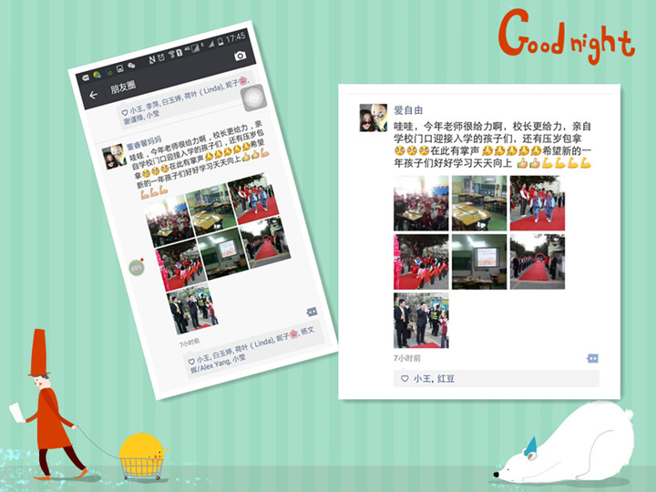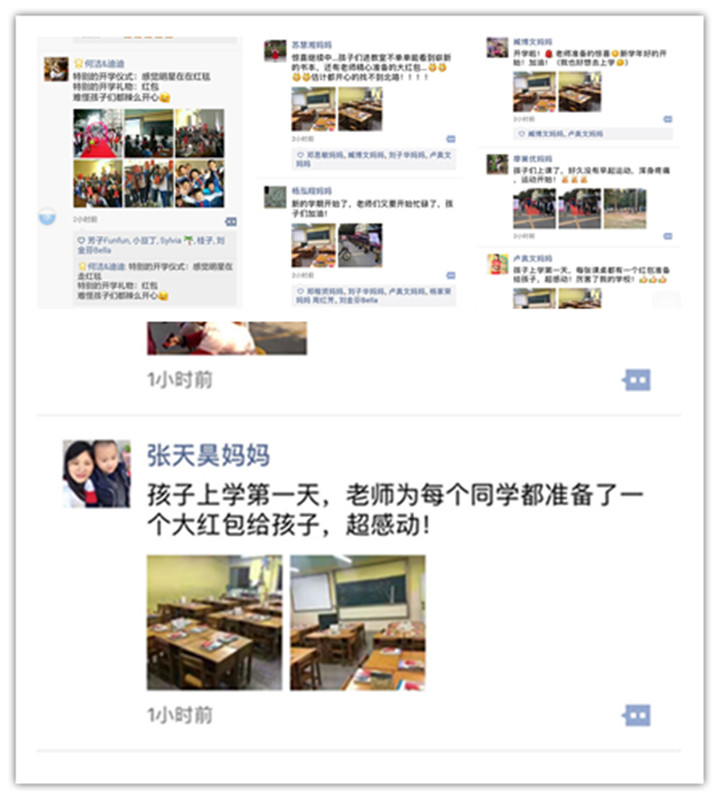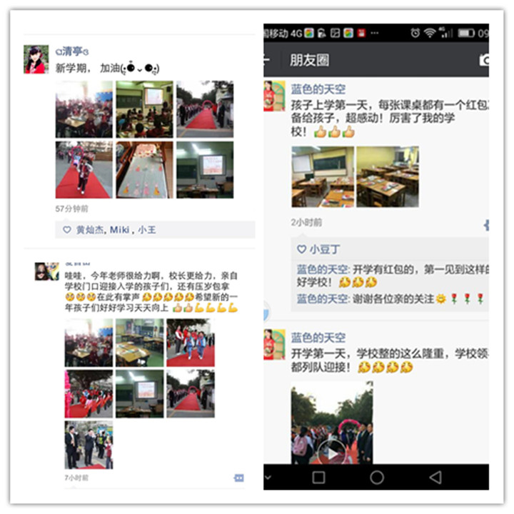家長“藍(lán)色的天空”在朋友圈中發(fā)圖片說:“孩子上學(xué)第一天,學(xué)校整得這么隆重,超感動(dòng)!厲害了我的學(xué)校!”;家長“沙”發(fā)朋友圈說“開學(xué)啦!老師給同學(xué)們帶來了驚喜,新學(xué)年好的開始,加油!”
