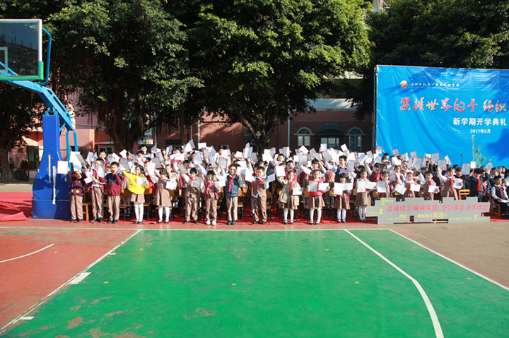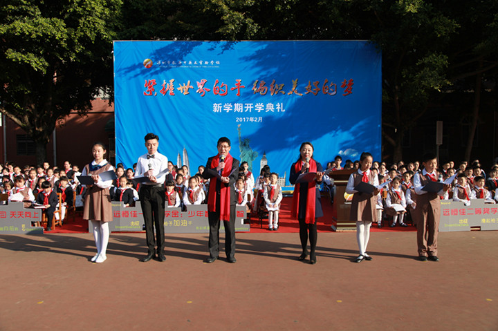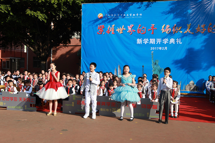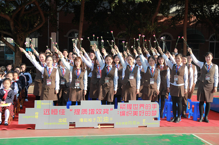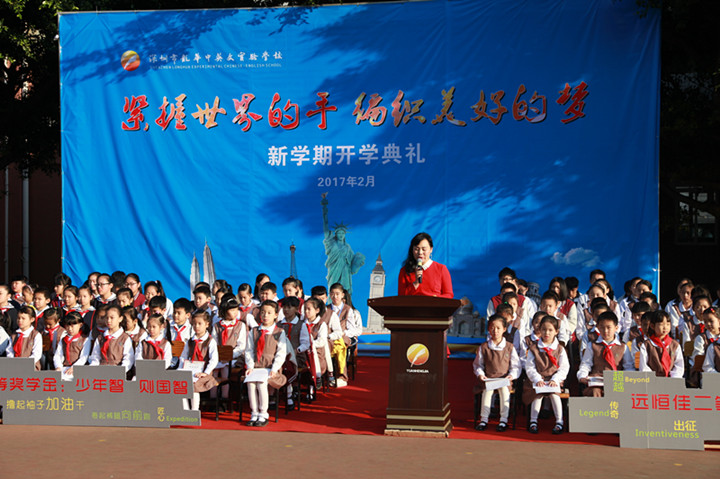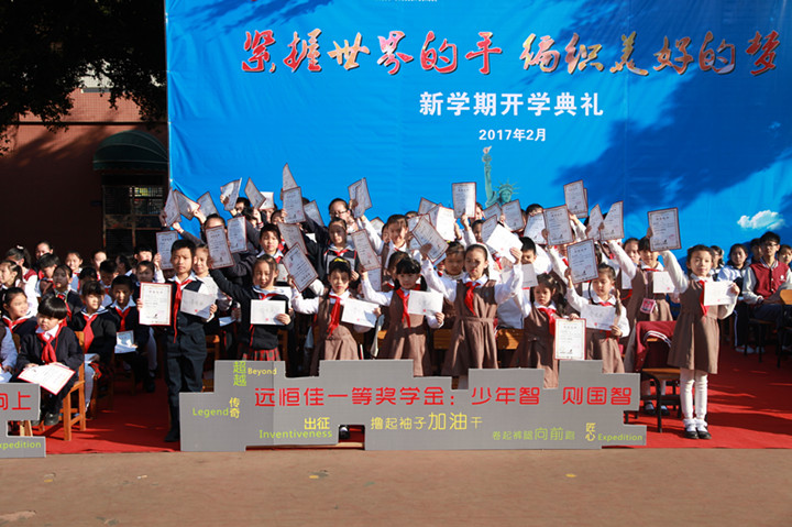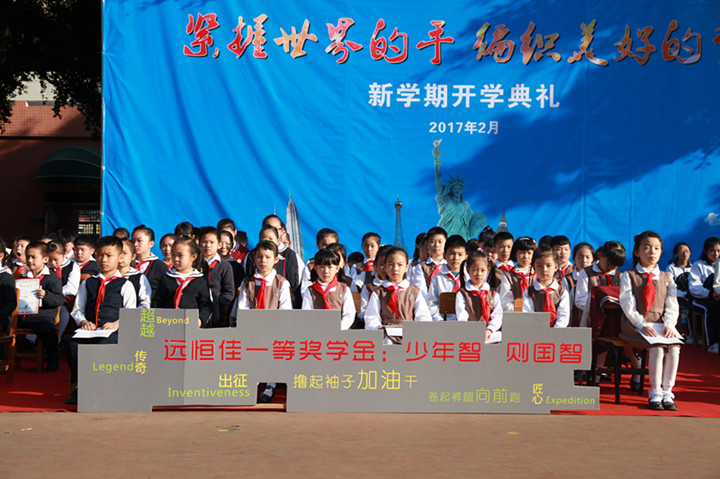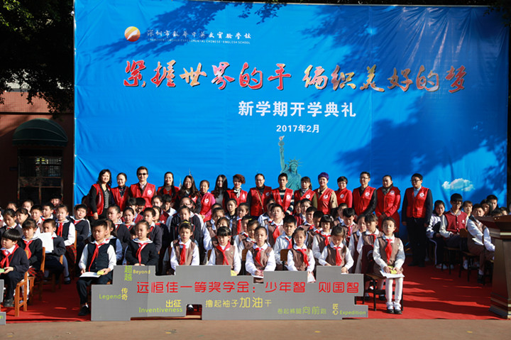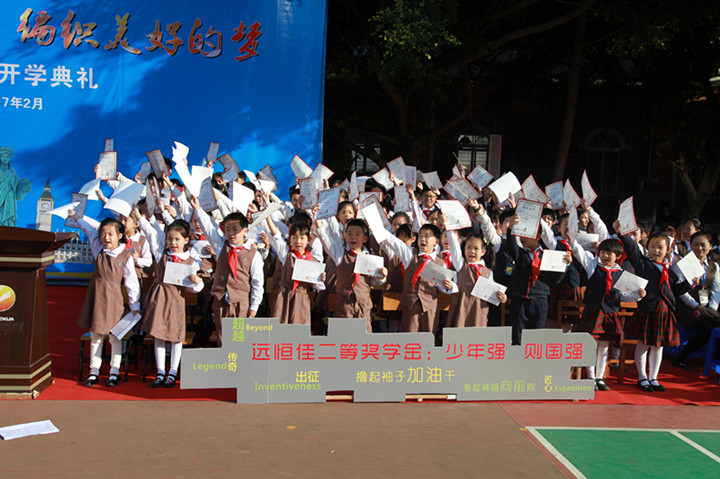 2017年02月15日,深圳市龍華中英文實驗學(xué)校在運動場舉行新學(xué)期開學(xué)典禮。今春的開學(xué)典禮呈現(xiàn)出新設(shè)計、新流程、新風(fēng)尚的特點?;顒幼钜俗⒛康氖亲谥飨_上的四個方陣,分別是獲得“遠(yuǎn)恒佳獎學(xué)金”的三個學(xué)生方陣以及獲得學(xué)?!疤豳|(zhì)增效獎”的教師方陣。其中,共有182名學(xué)生獲“遠(yuǎn)恒佳獎學(xué)金”,發(fā)放獎金三萬零五百;共有74名教職工獲學(xué)?!疤豳|(zhì)增效獎”,發(fā)放獎金十萬元。家委會成員和家長代表為獲獎師生頒發(fā)紀(jì)念品和鮮花,獲獎師生被請到主席臺就坐,成為開學(xué)典禮的主角,充分體現(xiàn)了學(xué)校開放辦學(xué)、尊重知識、尊重人才、表彰先進(jìn)的教育思想。