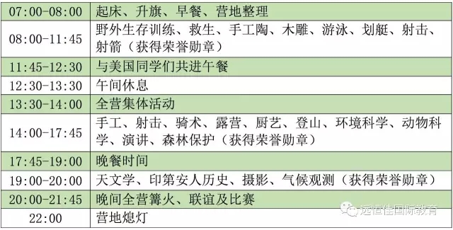 拓展新的社交圈、說(shuō)一口流利口語(yǔ)、培養(yǎng)創(chuàng)造性思維、開闊眼界、提升領(lǐng)導(dǎo)才能、強(qiáng)健體魄、富有擔(dān)當(dāng)精神、掌握野外生存技能……放松自在的全英文環(huán)境,充滿善意的外國(guó)玩伴,豐富多彩的教學(xué)課程,賞心悅目的藍(lán)天碧水,除了讓你搖身變成“美國(guó)通”,還能獲得珍貴的跨國(guó)“戰(zhàn)友情”!
