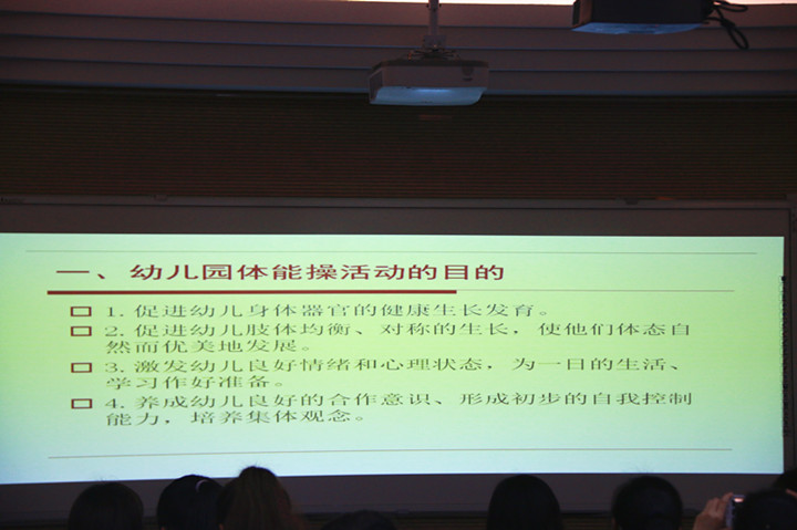 韓進老師在幼兒園采集最原汁原味的幼兒早操活動給學員觀看。幼兒園體能操編排的基本要求有四個部分:熱身(隊列)活動——基本操節(jié)——體能鍛煉——整理活動。在編排體操上選用器材與不使用器材的區(qū)別,選用器材是否符合主題,貼近孩子生活。