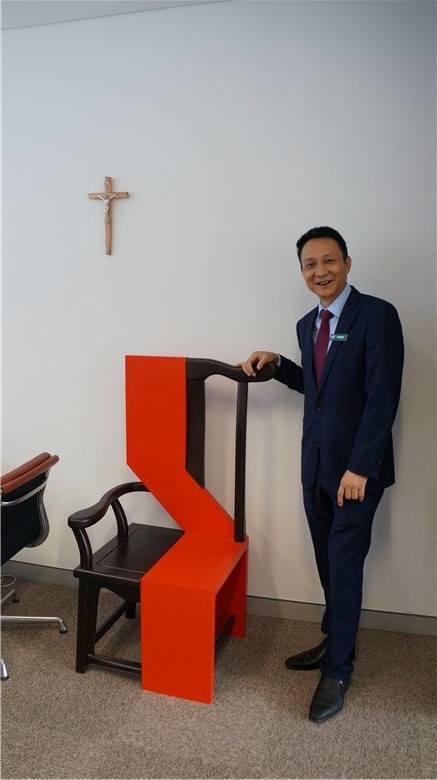 (圣奧古斯?。┧芜h(yuǎn)標(biāo)董事長與老師辦公室的一張凳子合影(該凳子為深圳國際留學(xué)生作品,木椅和紅色部分結(jié)合,象征著中西方的融合,也側(cè)面反映了學(xué)校的辦學(xué)特色)