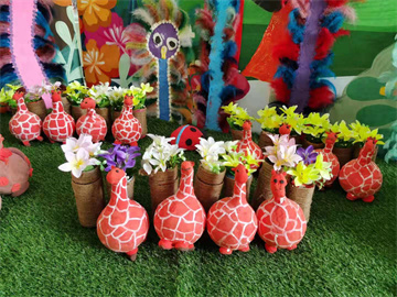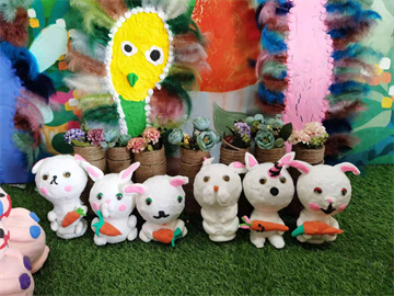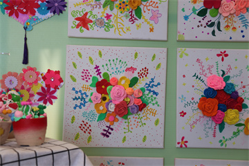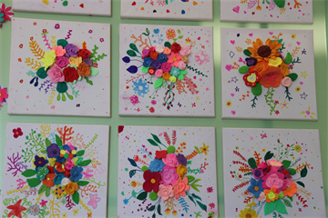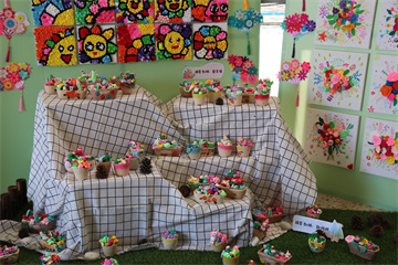 一花一世界,一樹一菩提。美麗的植物擁有治愈心靈的力量。二年級(jí)的同學(xué)圍繞“植物”主題進(jìn)行創(chuàng)作。淺綠色背景墻上展示水彩作品,繪畫作品,手工太陽花、粘土花、花朵扇等。地板鋪草皮,搭配格子布,展示粘土多肉花盆,營造出絢麗多彩,花香滿園的氛圍。讓我們一起在二年級(jí)同學(xué)創(chuàng)造的植物園中感受心靈的蕩滌吧!