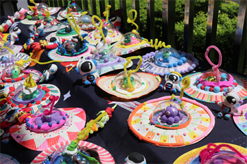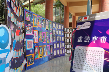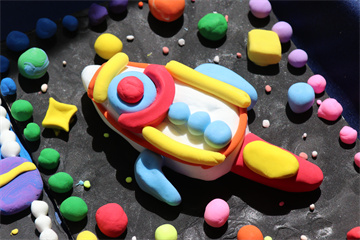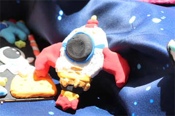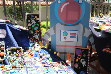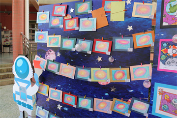 我們來自哪里?擁有無盡未解之謎的太空,總是讓孩子們心生無限的向往。這份對(duì)生命的探索和對(duì)未知世界的好奇促使五、六年級(jí)學(xué)生以“宇宙”為主題進(jìn)行了藝術(shù)創(chuàng)作。背景墻采用太空背景,搭配太空桌布和網(wǎng)格架展示六年級(jí)的外星飛碟和黑白裝飾畫,高低錯(cuò)落紙箱上則展示了五年級(jí)制作的宇宙黏土畫。讓我們跟隨五、六級(jí)大孩子們一起探索宇宙的奧秘吧!